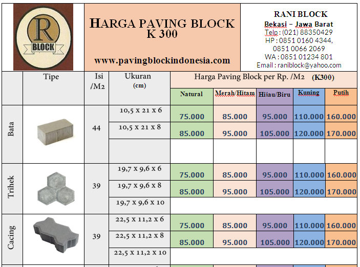 Yaitu k300, dengan kemampuan untuk menahan beban dan tekanan hingga 300 kg per meter perseginya. Berikut daftar harga paving block per meter terbaru untuk bulan juni 2021 yang dirangkum dari berbagai depo bahan bangunan. Setelah itu, kalikan dengan harga paving block, biasanya paving block atau conblock dijual per meter persegi ( m2 ) misalkan harganya rp. Harga paving block semarang per meter terbaru. Untuk harga paving block bata yaitu mulai dari rp 85.000 per meter persegi dengan ketebalan 6 cm.
